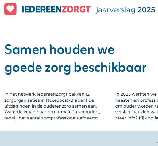 In het jaarplan 2026 beschrijft IedereenZorgt hoe we als lerend netwerk samen werken om de ouderenzorg in Noordoost-Brabant beschikbaar en mensgericht te houden. We bouwen voort op de ervaringen van de afgelopen jaren en spelen in op een groeiende en veranderende zorgvraag.