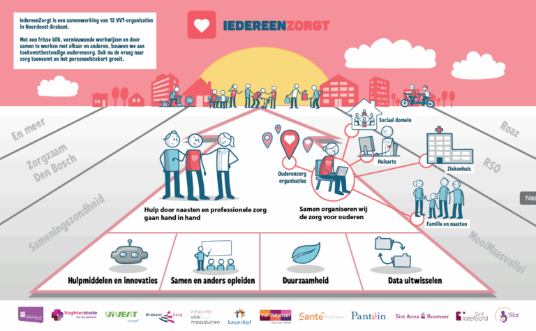 De 12 organisaties van IedereenZorgt werken samen om digitale informatie-uitwisseling te verbeteren. Slimme data en digitale oplossingen helpen de zorg beter en efficiënter te organiseren, zodat informatie veilig en snel gedeeld kan worden tussen cliënten, zorgorganisaties en ketenpartners.